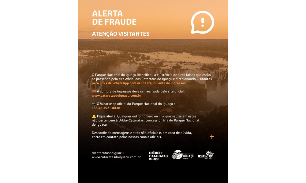 O Parque Nacional do Iguaçu, abrigo das Cataratas do Iguaçu, orienta os visitantes a ficarem atentos aos canais oficiais de informação e venda de ingressos,