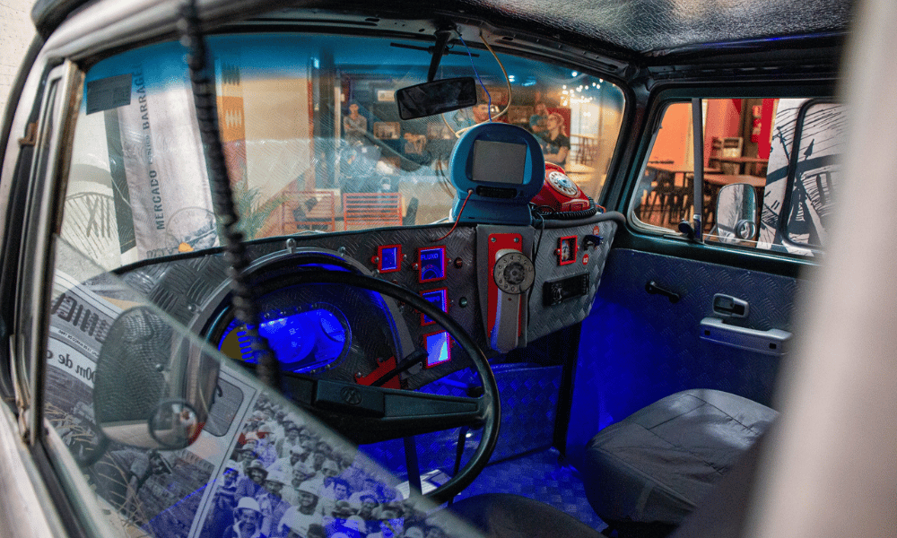 Instalada dentro do Mercado Público, ao lado do palco interno, a Kombi cenográfica funciona como uma cápsula do tempo. Ao entrar no veículo, o visitante é conduzido por uma narrativa audiovisual que mistura ficção e registros históricos, com imagens reais da construção da usina, cenas da antiga COBAL e efeitos especiais que ampliam a sensação de imersão.