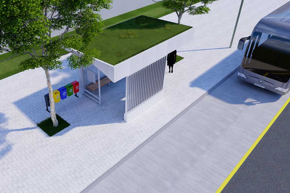 As duas propostas compartilham soluções como cobertura com vegetação (telhado verde), plantio de árvores nativas ao lado do ponto, uso de pavimentação clara no piso do entorno e fechamentos laterais em vidro para proteger das chuvas. Essas escolhas, juntas, reduziriam em até 6° C a temperatura dentro dos abrigos. “O índice internacional de estresse térmico (chamado UTCI) também melhorou nos dois modelos propostos”, detalha Guilherme Santos.